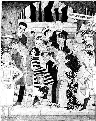 One of Barton's popular caricatures was "A Tuesday Night at the Cocoanut Grove in Los Angeles As Imagined by a Noted American Artist, Ralph Barton", which was published in the June 1927 issue of Vanity Fair.[8] It pictured dozens of celebrity actors including Clara Bow, Buster Keaton, Charlie Chaplin, Greta Garbo, Mary Pickford and Louise Brooks. The illustration was later printed on fabric and turned into a dress.[9]