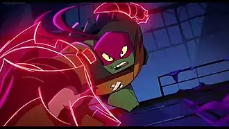 His new family's status was soon put to the test when their home was attacked by M.O.U.S.E.R. robots and Splinter was abducted. Raphael fought alongside his brothers to get their father back but came to the attention of the Shredder and the Foot Clan in the process.
