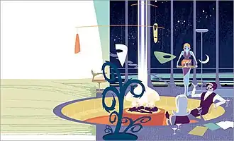 Through the 1990s, aided by the introduction of the Macintosh, Hughes pushed his illustration work in a more stylised graphic direction. Adopting first Freehand than Adobe Illustrator, he used expanses of flat colour and texture in asymmetric and dynamic layouts, his characters became more elegant and exaggerated, and the type, generally custom designed for each illustration, became an integral part of his imagemaking process. This flat vector style has been dubbed "Sans Ligne" in reference to the European "Ligne Claire" school by artist Will Kane. Hughes considers his combination of design, illustration and typography to be a return to the working methods of the poster artists of the early 20th century, a period when artists like the Stenberg Brothers, Cassandre and Jean Carlu combined type, image and layout to achieve a dynamic, integrated whole.