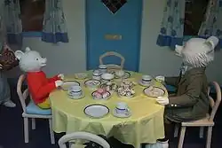 Most of the other characters in the series are also anthropomorphic animals. They are all scaled to be about the same size as Rupert, regardless of species. Rupert's animal friends are usually referred to as his "chums" or "pals." Aside from his best friend Bill Badger, some of the most enduring pals are an elephant (Edward Trunk), a mouse (Willie), Pong-Ping the Pekingese, Algy Pug (who actually pre-dates Rupert),[4] Podgy Pig, Bingo the Brainy Pup, the identical twins Freddy and Ferdy Fox, the identical twins Reggie and Rex Rabbit, and Ming the dragon. The kindly Wise Old Goat also lives in Nutwood, and helps Rupert in some of his adventures. One of the most unusual and evocative characters is Raggety, a woodland troll-creature made from twigs, who is often very grumpy and annoying. In the 2006 television revival of the series, Raggety has been transformed into a friendly elf with broken English. There is also a recurring country Police Officer who is an adult dog named PC Growler.[5] There are also a few human characters in the stories, such as the Professor (who lives in a castle with his servant, Bodkin), Tiger Lily (a Chinese girl), her father "the Conjuror," and several less frequently occurring characters such as Sailor Sam, Gaffer Jarge, Captain Binnacle, the Sage of Um (who is seen travelling in a magical upside down umbrella) and Rollo, the Gypsy boy. There is also a recurring Merboy. During his time as Rupert writer, Alfred Bestall added further characters such as the girl guides Beryl, Pauline and Janet, with Beryl's cat, Dinky. These characters were based on Girl Guides from Bestall's own church who asked him in late 1947 if they could have their own adventure with Rupert. They remain part of the comic series even today.