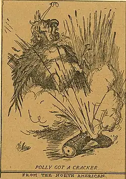 Charles Nelan, a cartoonist working for the anti-Quay North American newspaper out of Philadelphia, capitalized on the candidate's remarks by drawing him as a conceited parrot. Referencing the parrot's propensity for mimicry, the caricatured bird repeated the words of party elders: metaphorically, Nelan accused Pennypacker of being a rubber stamp for the desires of Quay and his cronies. Later cartoons similarly implied that the judge was tainted by his association with Quay, but Pennypacker won the governor's race anyway.[4][2] Despite his victory, Pennypacker harbored ill will against the cartoonists, with his inaugural address criticizing "sensational journals" as a "terror to the household, a detriment to the public service, and an impediment to the courts of justice."[6]