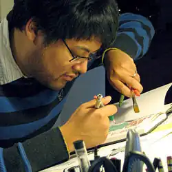 O'Malley wanted to write a shōnen-style comic book series, although he had only read one such series at the time, Ranma ½; in the early 2000s, Japanese manga had not yet achieved significant popularity in North America. O'Malley gained inspiration from the book Even a Monkey Can Draw Manga by Koji Aihara and Kentaro Takekuma. In 2002, O'Malley's roommate, who worked in a comic book store, brought the book to him while O'Malley was working on Lost at Sea and was planning Scott Pilgrim. Upon reading the book O'Malley realized that, despite the satirical tone, it could be an effective guide to how the Japanese comic book industry worked.[11] O'Malley said that Ranma ½ was the strongest influence and Atsuko Nakajima, the character designer of the Ranma ½ anime and other anime, was an influence to a lesser extent.[12] He added that the "exploded page layouts" of Koudelka, a work by Yuji Iwahara, directly influenced the "full-bleed layouts" of Scott Pilgrim.[12] O'Malley said that Osamu Tezuka began influencing his work as he created Volumes 3 and 4. He said, "You can see his influence start to creep in here and there but he's a larger inspirational figure to me than just his drawing style."[12] In regards to the FLCL anime, O'Malley said that while it was an influence, it was "not as much of a direct influence on Scott Pilgrim as people seem to think."[12]