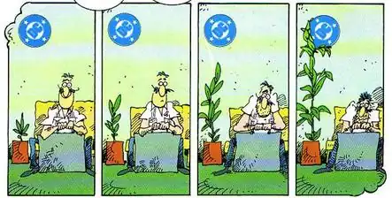 After looking at old comic books, Aragonés chooses Johnny DC, the company's promotional mascot from the 1960s, as the villain. Allegedly, the character was "fired" by DC when a new comic book style was decided by the editors. Johnny DC talks briefly to the Justice League, condemning their change of attitude, and then "adapts itself to the 90s", becoming a gigantic monster, parodying the archetypes of characters of the time.