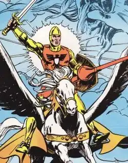 ![]() Shining Knight and Winged Victory, from the cover of All-Star Squadron #62 (October 1986); art by Mike Harris and Tony DeZuniga. | |