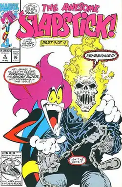 ![]() Slapstick and Ghost Rider in the cover of The Awesome Slapstick #4 (February 1993). Art by James Fry. | |