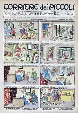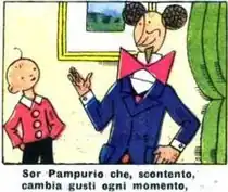 Started in 1929, the comic strips were published, with some breaks, by Il Corriere dei Piccoli until 1978.[1] Every episode starts depicting Sor Pampurio ("Mr. Pampurio")'s happiness about his new house, a happiness that turns in a few frames, for a reason or another, in an increasing discontent and in a new moving at the end of any story.[2]