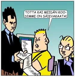 The comic is about a fictional software company and the IT industry in general. The setting is somewhat similar to Dilbert, but the style differs by concentrating more on actual nerd trivia and less on business stereotypes and zany interaction between characters. The comic was a pioneer of Finnish webcomics.[1][2] Its site received over 250,000 hits per month in 2007[3] (in a language with 5.2 million speakers) and has been featured in Ilta-Sanomat,[2][4] Iltalehti Online[2] and ITviikko.[2][5] Frequent visiting of the Sosiaalisesti rajoittuneet web site is regarded as a sign of a nerd behaviour.[6]