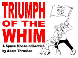 A book collection, Triumph of the Whim, was published in late 1997. It consists of 94 pages of selected existing Space Moose cartoons and 6 pages of previously unpublished Space Moose strips.[6] Most strips were available on the Space Moose web site.