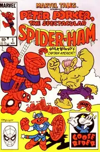 Spider-Ham was first featured as star of the 1983 humorous one-shot Marvel Tails, with a backup cast of other anthropomorphic talking-animal parody versions of popular Marvel superheroes, such as Captain Americat (a cat version of Captain America), Hulk-Bunny (a rabbit version of Hulk) and Goose Rider (a goose version of Ghost Rider).[4]