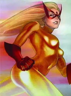 Spitfire (Lady Jacqueline Falsworth Crichton) is a fictional superheroine appearing in American comic books published by Marvel Comics. Created by Roy Thomas and Frank Robbins, the character first appeared in The Invaders comic book series as an intended replacement for the Union Jack character, but the costume design did not fit the female torso. Instead, the character of Spitfire, named after the Supermarine Spitfire fighter plane, was created.[1]