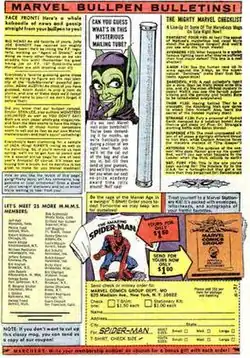 By 1973, much of the space formally used in the "Bullpen Bulletins" page for inside info and Bullpen gossip had been taken over by the checklist and special announcements. From at least 1974–1975, Marvel ran a "Bullpen Bonus Page", which hosted the checklist, fan page information, and announcements; freeing up the original "Bullpen Bulletins" page for the cherished "inside info" traditionally featured in that spot.[14] For the most part during these years, however, the page retained the tone and flavor of when Lee edited it.