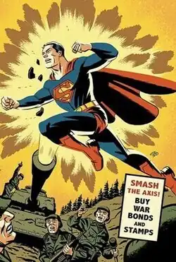 ![]() Kal-L as the original iteration of Superman, battles the Axis powers during World War II, as appeared on a variant cover of Action Comics 1000 (March 2018) by Michael Cho. | |