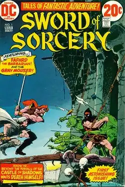 Sword of Sorcery was an American sword-and-sorcery comics anthology featuring Fafhrd and the Gray Mouser, heroes and rogues created by Fritz Leiber. Published bi-monthly by DC Comics, it ran for five issues in 1973, with a cover price of 20¢. The title was written by Denny O'Neil and featured art by Howard Chaykin,[1] Walt Simonson, and Jim Starlin. The book was cancelled after five issues due to bad sales.[2]