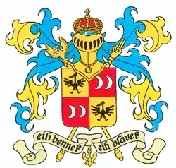 Quarterly, first and fourth Or a pelican displayed sable, second and third gules two increscents in fess argent; for a crest, on a barred helmet affronty or, mantled azure doubled Or, the Royal Crown of Syldavia[6] proper; behind the shield the Royal Sceptre of Syldavia[7] and a sceptre of justice[8] in saltire; the motto "Eih bennek, eih blavek" on a scroll below the shield, pendent therefrom the badge of the Order of the Golden Pelican.[9]