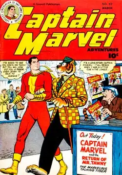 ![]() Captain Marvel and Tawky Tawny as depicted in Captain Marvel Adventures #82 (March 1948). Art by C.C. Beck. | |
