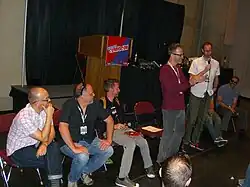 ![]() Kristiansen, at left, at the Man of Action panel at the 2012 New York Comic Con. | |