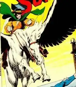 The pre-Crisis incarnation of Terra-Man is a boy from the Old West who the alien Currency-Criminal adopts after accidentally killing his father Jess.[2][3] As an adult, Manning kills the alien, becomes an interstellar outlaw, and tames the pegasus-like alien Nova.[4]