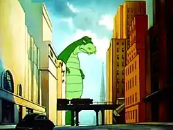 The Arctic Giant is the fourth of seventeen animated Technicolor short films based upon the DC Comics character of Superman, created by Jerry Siegel & Joe Shuster. This animated short was created by Fleischer Studios. The story runs nine minutes and covers Superman's adventures in defeating a giant defrosted dinosaur that terrorizes the city. It was released on February 27, 1942.[1] The short depicts a Godzilla-esque scenario while predating the 1954 film by 12 years.[2] The actual Godzilla and Superman would eventually meet in a crossover comic Justice League vs. Godzilla vs. Kong in 2023.[3]