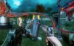 Jackie can use various firearms, such as submachine guns, shotguns, and assault rifles, and has the ability to dual wield some of these weapons.[2] Additionally, he is armed with a pair of Demon Arms, which resemble tentacles[3] and can be used to slash enemies or pick up various items within the environment (parking meters, car doors, etc.) to use as projectile weapons or shields.[4][1] The Demon Arms can rip out the heart of fallen enemies and devour them for health, pick up enemies for execution, or throw them.[5] The player is guided by a Darkling, a goblin-like creature that assists in combat and gathers weapons and ammo.[6][7] At several points, the player can directly control the Darkling, allowing them to squeeze into tight spaces that Jackie cannot enter and execute enemies from behind.[8] When exposed to light, Jackie's health regeneration and Darkness abilities are disabled.[9] In addition, his vision will become blurred and he will experience a ringing sound when exposed.[10] The player can disable these sources by shooting them, causing them to malfunction.[11]
