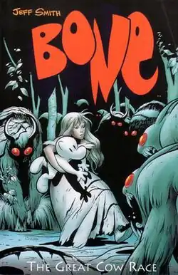 The Great Cow Race is the second book in the Bone series. It collects issues 7-11 of Jeff Smith's self-published Bone graphic novels, along with the short story "Up on the Roof" which was originally published in Wizard Presents: Bone 13½. The book was first published by Cartoon Books in its original black-and-white form in 1996. Paperback and hardback coloured editions were released in 2005 by Scholastic.