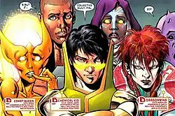 ![]() Legion Academy students Comet Queen, Chemical Kid, and Dragonwing as depicted in Adventure Comics #524 (May 2011). Art by Phil Jimenez (penciler), Andy Lanning (inker), and Steve Wands (letterer). | |