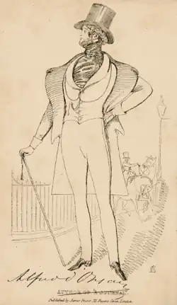 The magazine's first cover illustration, depicting a dandy peering at a butterfly through a monocle, was drawn by Rea Irvin, the magazine's first art editor. It was based on an 1834 caricature of the Count d'Orsay that appeared as an illustration in the 11th edition of the Encyclopædia Britannica.[54] The character on the original cover, now known as Eustace Tilley, was created for The New Yorker by Corey Ford. The hero of a series titled "The Making of a Magazine", which began on the inside front cover of the August 8 issue that first summer, Tilley was a younger man than the figure on the original cover. His top hat was of a newer style, without the curved brim. He wore a morning coat and striped formal trousers. Ford borrowed Eustace Tilley's last name from an aunt—he had always found it vaguely humorous. He selected "Eustace" for euphony.[55]