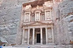 To produce accurate illustrations for the Ramona, Hergé and his assistant Bob de Moor travelled aboard a Swedish cargo vessel, the MS Reine Astrid, from Antwerp to Gothenburg and back, during which they took photographs and drew sketches.[14] Hergé had also collected press clippings depicting the Christina, a motor yacht owned by the Greek shipping magnate Aristotle Onassis, and used them as the basis for his depiction of Rastapopoulos' ship, the Sheherezade.[15] The aircraft, cars, and machinery that appear in the story were drawn by Roger Leloup, one of the members of the Studios Hergé.[16] In one scene in the latter part of the story, Hergé included a frogman, whose depiction was drawn from a press clipping of Lionel Crabb. [17] His depiction of the Emir's hideaway palace cut from the rock was based on the Al Khazneh in Petra, Jordan, which he had seen in an issue of National Geographic.[18]