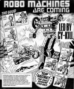 - ↑ Tom Tully (w), Kim Raymond (a). "The Robo Machines" Eagle (29 March to 29 July 1985). IPC Magazines.