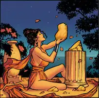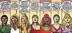 After the island had been destroyed by Imperiex during the "Our Worlds at War" storyline, Themyscira was rebuilt and relocated, this time to the Bermuda Triangle.[8] Designed by the likes of Julia Kapatelis, the Martian Manhunter, Steve Trevor, Canadian architect Jean Claude Tibet, and Amazon master designer Kaleeza Fashed, the new Themyscira was built with the help of alien technology. Adding to the re-creation of the islands, Themyscira was restored by the combined might of the Greek and Egyptian goddesses the Amazons worship. Transformed into a mighty series of floating islands dedicated to the free exchange of information and ideas, the new Themyscira was governed by members of both tribes of Amazons. After some time Themyscira was nearly destroyed in a jealous fit of rage by the goddess Hera. She was angry that Zeus was magically spying on the bathing form of Artemis via scrying the pool and kicked the pool itself.[8] Because of her actions the islands ceased to float in mid-air under their own power and instead resumed being a cluster of traditional islands once more.