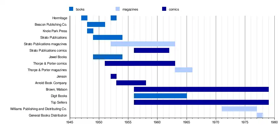- Strato Publications (1949–1962) — originally paperback books, then science fiction and fantasy digest format magazine reprints, and science fiction, super-hero and western comics reprints[43]