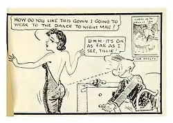 "Jewett was arrested following an investigation by authorities of the origin of a book of indecent pictures in which popular comic strip characters figure," a local newspaper reported.[16] "The arrests grew out of an investigation, which had been quietly going on for three or four weeks, following the finding that several Wiley high school boys were in possession of an obscene publication based on a current strip in the Sunday papers. Further inquiry led to a search of the printing offices conducted by Jackson Jewett, under the name of the Jewett Printing Company, where a number of zinc etchings, from which the strips were printed, together with a quantity of booklets, bound and ready for distribution, were seized. It was said at the time that the elder Jewett had taken the contract for printing the strips and had attended to their distribution."[17] Charles Jewett was sentenced to six months in a state workhouse, and father and son left Terre Haute afterward. It is not known today which particular bibles were involved, but the earliest bibles are sometimes dated to 1925, particularly early "Tillie and Mac" and "Maggie and Jiggs" stories which were issued without covers or titles at the time, and were not always eight pages long. The Kinsey Institute has in its possession an early Tillie and Mac story involving Mac finding a used condom in Tillie's wastebasket ("I wondered where that had gone", she says brightly), which has an archivist's notation "First seen Oklahoma 1926".