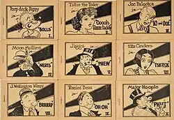 A popular comic strip character such as Tillie or Blondie might appear in as many as 40 eight-pagers drawn by ten artists. An entire series of ten bibles drawn by "Mr. Prolific" was based on famous gangsters; Legs Diamond, Al Capone, and Machine Gun Kelly were featured, while the artist working under the alias "Elmer Zilch" drew a set of eight comics about famous boxers such as Jack Dempsey. Another set of ten bibles drawn by Mr. Prolific featured radio stars, including Joe Penner and Kate Smith. Blackjack drew a set of ten comics using characters from Snow White, with each of the seven dwarfs starring in his own X-rated title.
