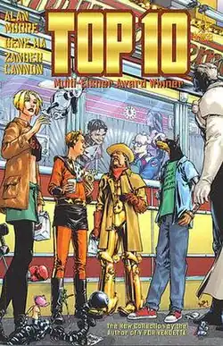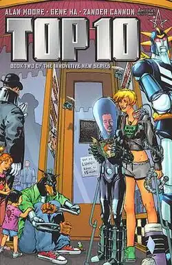 Top 10 is a superhero comic book limited series published by the America's Best Comics imprint of WildStorm, itself an imprint of DC Comics. Written by Alan Moore and illustrated by Gene Ha and Zander Cannon, the series details the lives and work of the police force of Neopolis, a city in which almost everyone, from the police and criminals to civilians, children and even pets, has super powers and/or colourful costumes. It won the Eisner Award for Best Continuing Series in 2001.