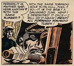 The source of the image is Jack Abel's art in the Bob Haney-written story "Battle of the Ghost Ships?", in DC Comics' Our Fighting Forces #71 (October 1962), although the content of the speech balloon is different.[2][3][4] According to the Lichtenstein Foundation website, Torpedo...Los! was part of Lichtenstein's second solo exhibition at Leo Castelli Gallery of September 28 – October 24, 1963, that included Drowning Girl, Baseball Manager, In the Car, Conversation, and Whaam![5][6] Marketing materials for the show included the lithograph artwork, Crak![7][8]