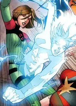 Trance is seen with Dragoness and Toad, who are being pursued by H.A.M.M.E.R. agents. After Dragoness is taken out, Trance goes into her astral form only to have her power disrupted when her body is shot with tasers. Gambit shows up and knocks out the H.A.M.M.E.R. agents. Trance, in her astral form, lies on the ground asking for help when Ariel and Onyxx appear and take her to safety. Later, Mindee Cuckoo informs Rogue that Trance never made it back to base and that she is detecting Trance's thoughts somewhere downtown, prompting Rogue and her team to search for her.[3] Trance's power disrupted Ariel's attempt to teleport her to safety. Rogue finds Trance and her powers are flaring out of control creating powerful uncontrollable bio-electric blasts. Rogue tries to help calm Trance and help her gain control when Ms. Marvel appears. After taking out Gambit and Danger, Rogue and Ms. Marvel fight, unfortunately Rogue is losing until Trance regains control and jumps in to help Rogue. Trance learns that her astral form is able to punch Ms. Marvel when they are both intangible. After Gambit stuns Ms. Marvel, they teleport back to base where Trance receives medical attention.[4]
