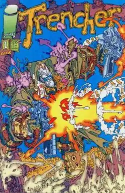 Trencher is an American comic book series, that was created, written and drawn by Keith Giffen and released by Image Comics in 1993. It totaled only four issues before it ended, with a 5th issue indicated in the end caption, and an ad for a 5th issue in Images of ShadowHawk #2. However there never was a 5th issue and the next Trencher appearances was in Images of Shadowhawk #1–3 in 1993 also from Image Comics, Trencher X-Mas Bites Holiday Blow-Out in December 1993, and in Blackball Comics #1 in March 1994, both from short-lived UK publisher Blackball Comics. Giffen illustrated this in a sort of twisted ligne Claire style with some hyper-detailed elements of Geoff Darrow. All stories are ultraviolent and a parody of the then prevalent "Image Comics style".