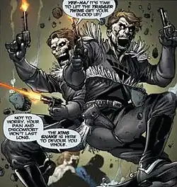 In Infinite Crisis, the Trigger Twins join the Secret Society of Super Villains before being killed in battle.[8] In Blackest Night, the two are temporarily resurrected as Black Lanterns.[9]