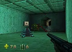 The gameplay was praised for its deep single-player missions and varied enemy types.[15][31] Game Revolution highlighted the long and complex levels, but admitted that players may "[run] around in circles for hours trying to figure out where to go next. This may be enjoyable for people who like puzzles and long gameplay, but it is aggravating for more action-oriented players".[34] N64 Magazine gave high marks to the game's level design and explained that the addition of mission objectives "gives the game more focus and betters its predecessor's pretty limited and fairly simple key-collection."[15] The artificial intelligence of enemies was considered more advanced than GoldenEye 007's, as enemies can take refuge behind objects and pop up to throw explosives towards the player.[31][38][15] GamePro also noted that they were more aggressive than Dinosaur Hunter's.[33] The game's large arsenal of weapons was also praised,[15] with GameSpot remarking that the Cerebral Bore is "possibly the grossest weapon ever conceived".[35] The multiplayer mode was praised for its use of 3D space and innovative game types.[37]