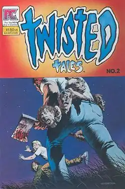 Twisted Tales was published on a bi-monthly schedule by Pacific Comics from November 1982 to May 1984, running for eight issues. After Pacific went bankrupt, the titles were taken over by Eclipse. After publishing two further editions, Eclipse announced they wouldn't be continuing Twisted Tales or Jones and Campbell's fellow anthology Alien Worlds, instead replacing them with their own titles, with the sexual content reduced.[1] The replacement for Twisted Tales was Tales of Terror; while Jones occasionally contributed to the new anthology it featured numerous other writers.[2] In August 1986, Blackthorne Publishing released Twisted Tales 3-D #1 (#7 in their 3-D series), with reprints of stories taken from earlier issues; meanwhile Eclipse would publish The Twisted Tales of Bruce Jones, reprinting various material.[3]
