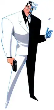 - The Harvey Dent incarnation of Two-Face appears in Batman: Caped Crusader, voiced by Diedrich Bader.[15] This version was disfigured by an associate of Rupert Thorne, which affected the right side of his face instead of his left like traditional depictions. Additionally, he lacks a multicolored outfit and is prone to reckless, self-destructive behavior and bursts of aggression. He dies after he sacrificed himself to save Barbara Gordon from corrupt cop Arnold Flass.