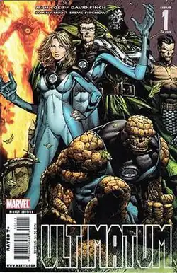 "Ultimatum" is a 2009 comic book storyline published by Marvel Comics under its Ultimate Marvel imprint. It consists of a core five-issue eponymous miniseries written by Jeph Loeb and illustrated by David Finch that was published from January to September 2009, and a number of tie-in books. The storyline deals with Magneto's attempts to destroy the world following the apparent deaths of his children, Scarlet Witch and Quicksilver in The Ultimates 3.