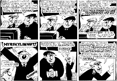 Most of the strips are about the main characters having some sort of fantasy adventure, as if reliving their childhood or teenage. These adventures were often rather eccentric, such as one set in Thoreau's Walden. They also flaunt their literacy in a strip where they meet author Veikko Huovinen and incense him by talking exclusively in sentences which contain the title of one of his books.