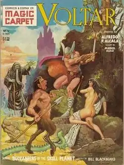 - ↑ Per Arndt, "The Warren Magazines", artist "[Alfredo] Alcala's Voltar character had been invented in the Philippines back in the 1960s.... He debuted in America in Magic Carpet #1 (1977) with scripting by Manuel Auad."
