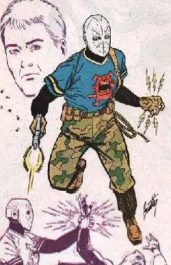 Claire's will named Jack as her sole beneficiary and made him a considerably wealthy man. Furious over all the deaths he'd witnessed, but unsure of how to proceed, Jack took the somewhat-facetious advice of a friend to "use the money to fight the mob". He opened up his own car mechanic/body shop as a public identity, then secretly tracked down the rival gang members who ordered the hit. He created a costume of camouflage pants, combat boots, a local college football jersey emblazoned with a snarling red dog (hiding his protective body armor), and a hockey goaltender mask to conceal his identity. Armed with a Jatimatic GG-95 PDW and a pair of electrified "shock gloves", he killed the gang leaders and the hitman who had killed Claire.[3]