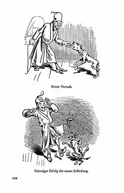 Pater Filucius (Father Filucius) is the only illustrated satire of this period suggested by the publisher. Also aimed at anti-Catholic taste and buyers, it criticizes the Jesuit Order. Kraus felt it was the weakest of all three anti-clerical works.[85] Some satires refer to contemporary events, such as Monsieur Jacques à Paris during the Siege of 1870 (Monsieur Jacques à Paris während der Belagerung von 1870). Busch biographer Michaela Diers declares the story "tasteless work, drawing on anti-French emotions and mocking the misery of French people in Paris, which is occupied by Prussian troops".[86] It depicts an increasingly desperate French citizen who at first eats a mouse during the German siege, then amputates his dog's tail to cook it, and finally invents an explosion pill which kills his dog and two fellow citizens.[87] Weissweiler believes that Busch wrote with irony.[53] In Eginhard and Emma (1864), a fictional family story that takes place in the Charlemagne era, he criticizes the Holy Roman Empire and calls for a German empire in its place; in The Birthday or the Particularists (Der Geburtstag oder die Partikularisten) he satirizes the anti-Prussian sentiments of his Hanover countrymen.[88]