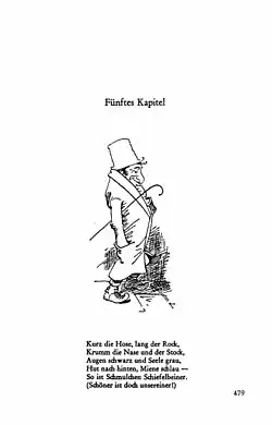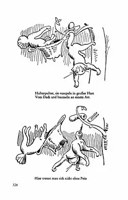 The effect of Busch's illustrations is enhanced by his forthright verse, with taunts, derision, ironic twists, exaggeration, ambiguity, and startling rhymes.[125] His language had an influence on the humorous poetry of Erich Kästner, Kurt Tucholsky, Joachim Ringelnatz, and Christian Morgenstern.[126] The contrast in his later work between comic illustration and its seemingly serious accompanying text – already demonstrated in his earlier Max and Moritz – is shown in Widow Bolte's mawkish dignity, which is disproportionate to the loss of her chickens:[127]