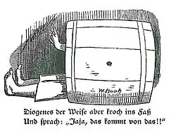 In 1873 Busch returned several times to Munich, and took part in the intense life of the Munich Art Society as an escape from provincial life.[46] In 1877, in a last attempt to be a serious artist, he took a studio in Munich.[46] He left Munich abruptly in 1881, after he disrupted a variety show and subsequently made a scene through the effects of alcohol.[47] The 1878 nine episode illustrated tale Eight Sheets in the Wind describes how humans behave like animals when drunk. Busch's biographer Weissweiler felt the story was only superficially funny and harmless, but was a study on addiction and its induced state of delusion.[48]