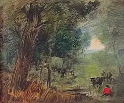 Many pictures depict the countryside at Wiedensahl and Lüthorst. They include pollarded willows, cottages in cornfields, cowherds, autumn landscapes, and meadows with streams.[106] A particular feature is the use of red jackets, found in about 280 of 1000 Busch paintings and drawings. The muted or bright red coats are worn usually by a small figure, depicted from behind.[107] The paintings generally represent typical villages. Portraits of the Kesslers, and a series of other portraits depicting Lina Weissenborn in the mid-1870s, are exceptions. A painting of a 10-year-old girl from a Jewish family at Lüthorst portrays her as serious, and having dark, oriental features.[108]