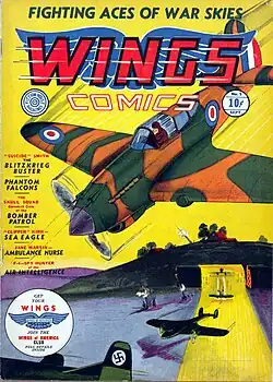 The title initially targeted "flight enthusiasts, with articles about the history of flight and aerobatics, such as wing walking."[1] With the U.S entry into World War II, Wings Comics began emphasizing "patriotic war stories,"[1] similar to those of Captain Midnight and Quality Comics' Blackhawk.[1] With the end of the war, Wings Comics returned its focus to historical stories, "real-life heroes of aviation,"[1] and text pieces on model aircraft.