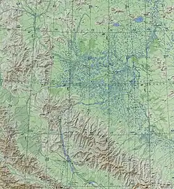 The lowland is crossed by the Indigirka River in its middle course.[1] Besides many smaller rivers and streams, three large left hand tributaries of the great river flow into it, the Selennyakh, Uyandina (with the Khatyngnakh) and Druzhina rivers. The Badyarikha limits the area in the east. The area is flat and mostly marshy, the average height of the plain being between 30 meters (98 ft) and 94 meters (308 ft) above sea level. The rivers are generally slow-flowing and meandering, connected by channels and with very boggy shores. The Aby Lakes, mostly small and numbering over 15,000, are dotting the lowlands. The largest are Lake Ozhogino[2] and Lake Suturuokha.[3]